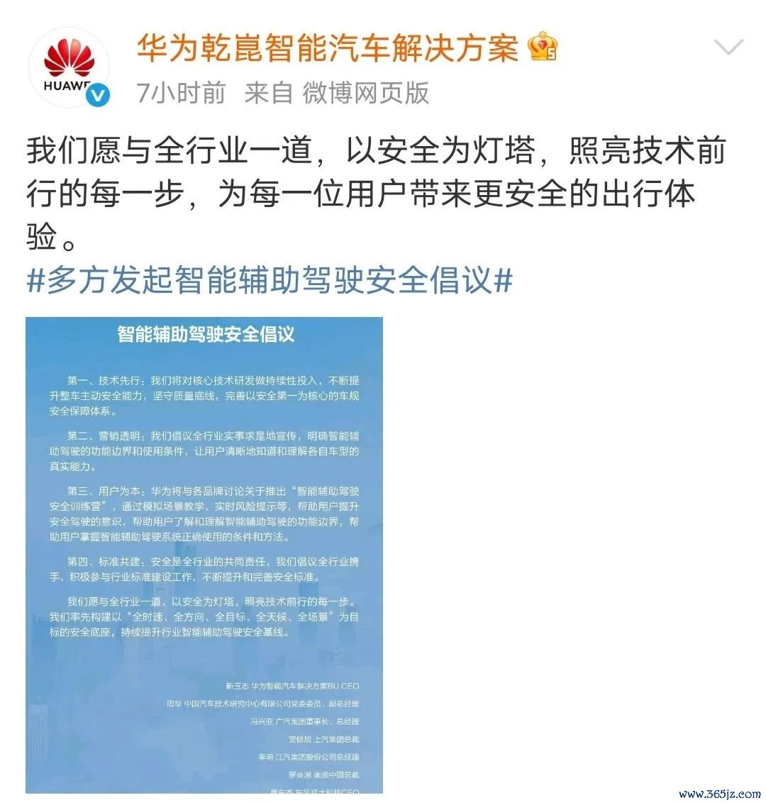 4月27日掌盘策略,华为乾崑智能汽车解决方案官方微博发布《智能辅助驾驶安全倡议》。这份倡议是由华为智能汽车解决方案BU、中国汽车技术研究中心以及广汽集团、上汽集团、江汽集团、奥迪中国、东风猛士科技、岚图汽车、深蓝汽车、北汽新能源、阿维塔科技、赛力斯汽车、奇瑞汽车等11家车企的高管共同发起。