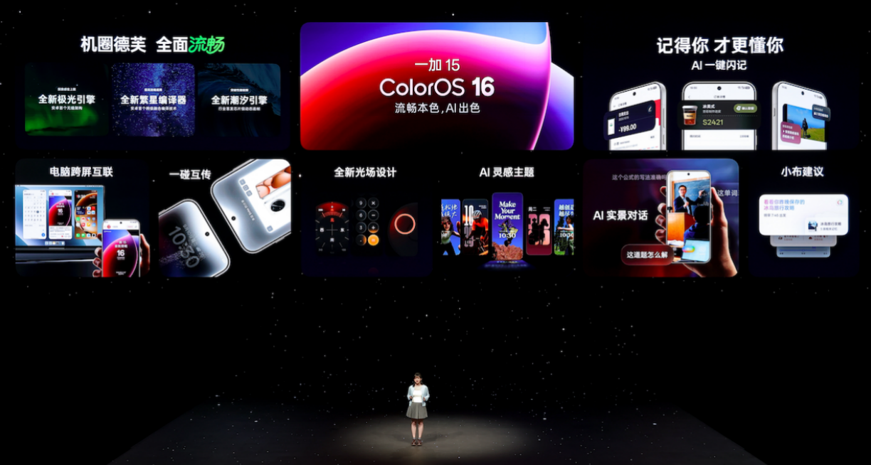 系统层面,一加 15 首发搭载ColorOS 16,带来更丝滑的交互体验。通过芯片级动态追帧技术,点击响应速度提升 40%,重载场景稳定性提升 37%。同时,AI 功能全面升级:「AI 一键闪记」可自动识别图片、视频中的文字信息,「超级文本」可智能生成可编辑文档。