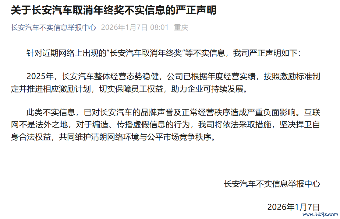 长安汽车:网传“取消年终奖”信息不实 已推进激励计划保障员工权益长安汽车:网传“取消年终奖”信息不实 已推进激励计划保障员工权益